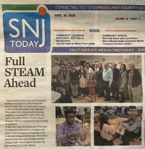 The American Institute of Architects South Jersey Section celebrated NJ Architecture Week with their 4th Annual Spaghetti-Marshmallow Tower Challenge on April 9, 2025, at the Boys and Girls Club of Cumberland County in Vineland, NJ. South Jersey Media captured the excitement of this STEAM event on the cover of SNJ Today!